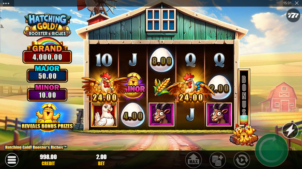 Land 3 or more Scatter symbols on the reels to trigger the Cluckin’ Cash Free Spins feature with 12, 15, or 20 spins! Collect Bonus symbols in the feature to fill a top prize meter and unlock different boosts that may award players with extra roaming Wilds, roaming Collects, Cash Prizes, and additional Free Spins!